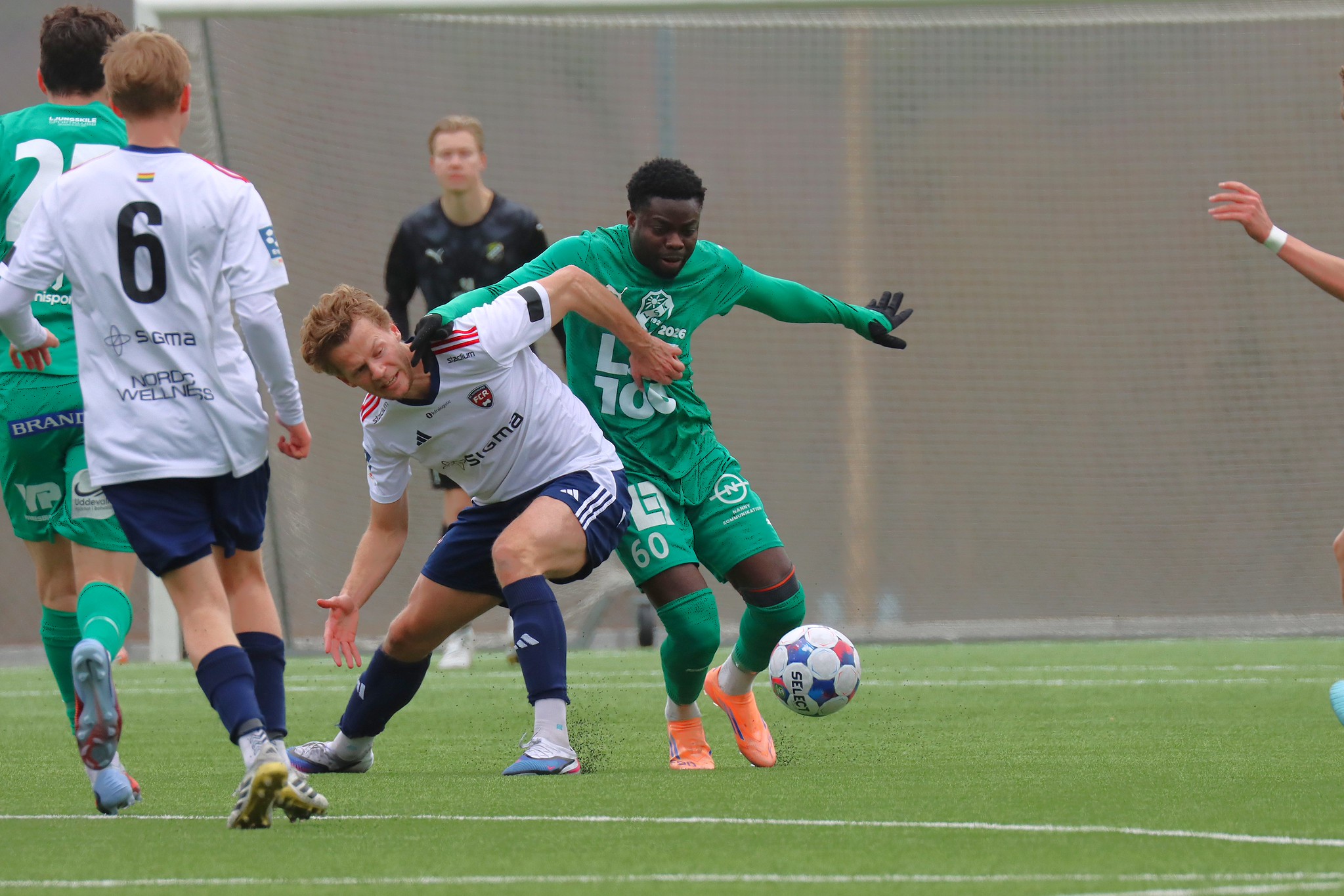Här noterar vi att precis halva matchtruppen består av nyförvärv, medan 7 av 11 av spelarna i startelvan var med även 2025. Nya för året från start var högerbacken Emilio Reljanovic, mittbacken Ivan Maric, spetsen Isaac Shears och i rollen som ”tia”: David Frisk. Matchen inleddes också med just den frenesi som man kan önska av en nykomling. Man bjöd upp ordentligt och Falkenberg fick knappt någon tid alls på sig att förvalta bollen innan minst en grön var uppe i press. Den som följt LSK de senaste säsongerna märkte nog dock omedelbart att skillnaden på motstånd inte gick att ta miste på. Även om FFF blev satta under press på ett sätt de antagligen inte var beredda på så syntes superettantempot onekligen i hur man tog sig an både närkamper och i frågan om bolltempo. Här gällde det att vara försiktig med var man tappar bollen samtidigt som man håller den mentala balansen inte trillar över i rädsla för att gå framåt. Den höll man, och följaktligen växlade vilket lag som var bollförande närmast ett dussintal gånger de två första minuterna då båda lagen gärna både ville framåt och var blixtsnabba in i duellerna. Första skottet på mål fick vi se efter 6 spelade minuter då Isaac Shears efter en lång sekvens där LSK naglat fast bollen i och runt FFF:s straffområde vek in och drog på ett lågt skott mot första stolpen. Hemmalagets målvakt var dock snabbt nere och kunde fånga bollen.
