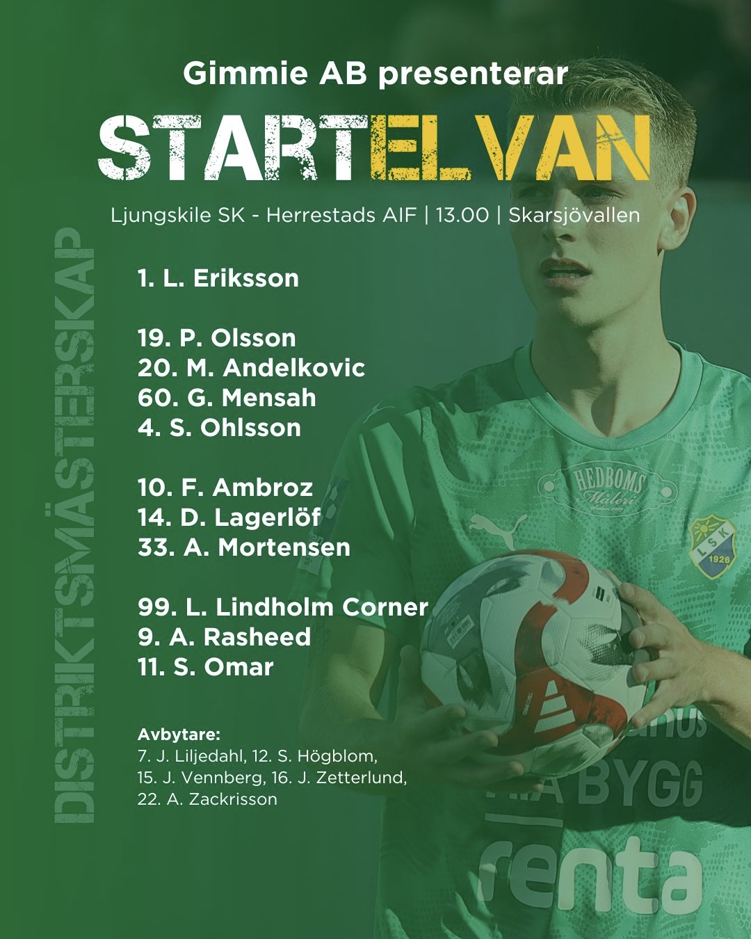 Det är snart dags för DM-final mot Herrestads AIF med matchstart kl: 13:00 på Skarsjövallens konstgräs. Dagens preliminära startelva kan vi presentera i samarbete med Gimmie AB.