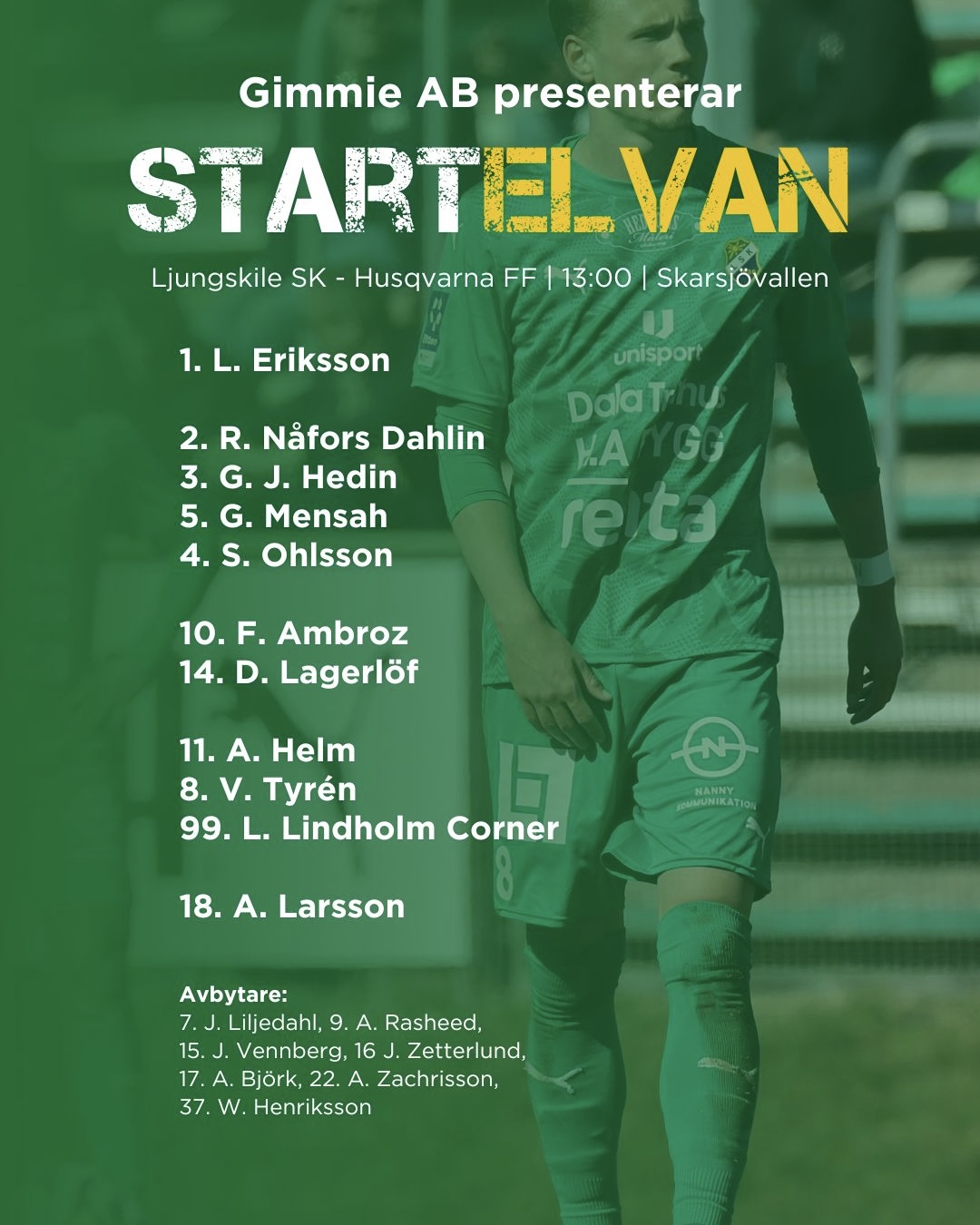Det är snart dags för hemmamatch mot Husqvarna FF med matchstart kl: 13:00 på Skarsjövallen. Dagens preliminära startelva kan vi presentera i samarbete med Gimmie AB.