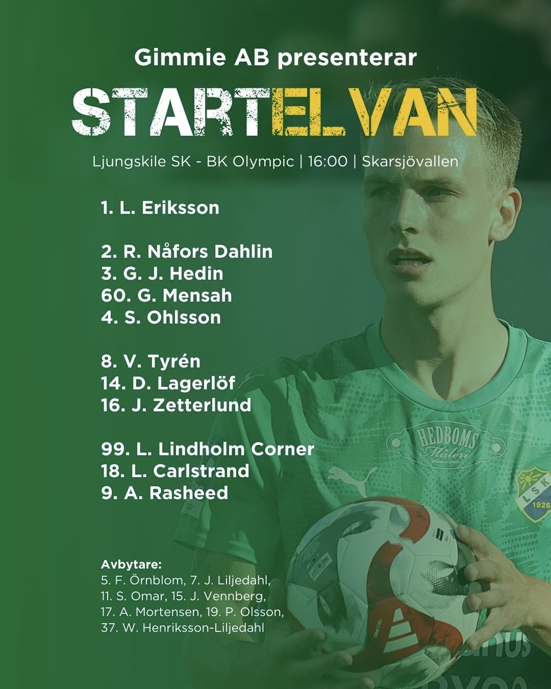 Det är snart dags för hemmamatch mot BK Olympic med matchstart kl: 16:00 på Skarsjövallen. Dagens preliminära startelva kan vi presentera i samarbete med Gimmie AB.