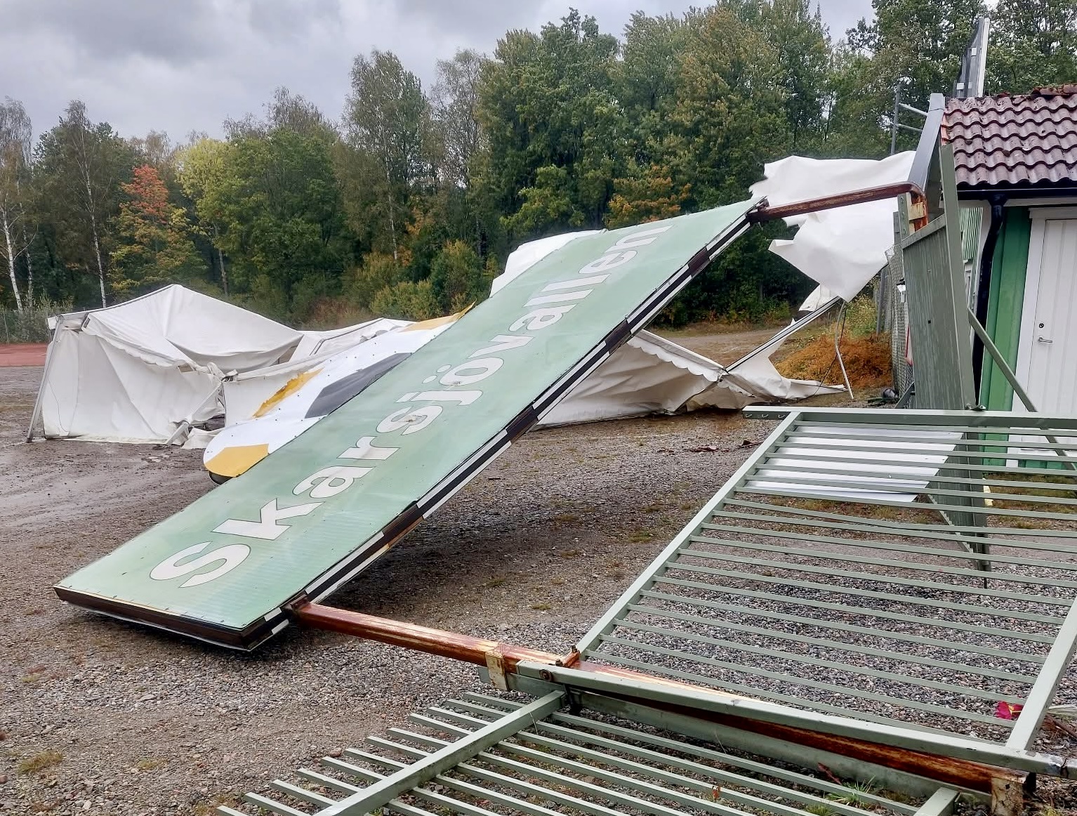 Vid huvudentrén på Skarsjövallen har portalen och hela entrén rasat ihop. Som om inte detta var nog så har även det närliggande serveringstältet blåst iväg och förstörts. En översyn och ett första omhändertagande skedde under helgen, men nu behövs fler krafter för att komma iordning vid huvudentrén.